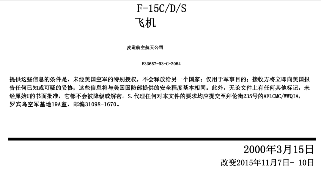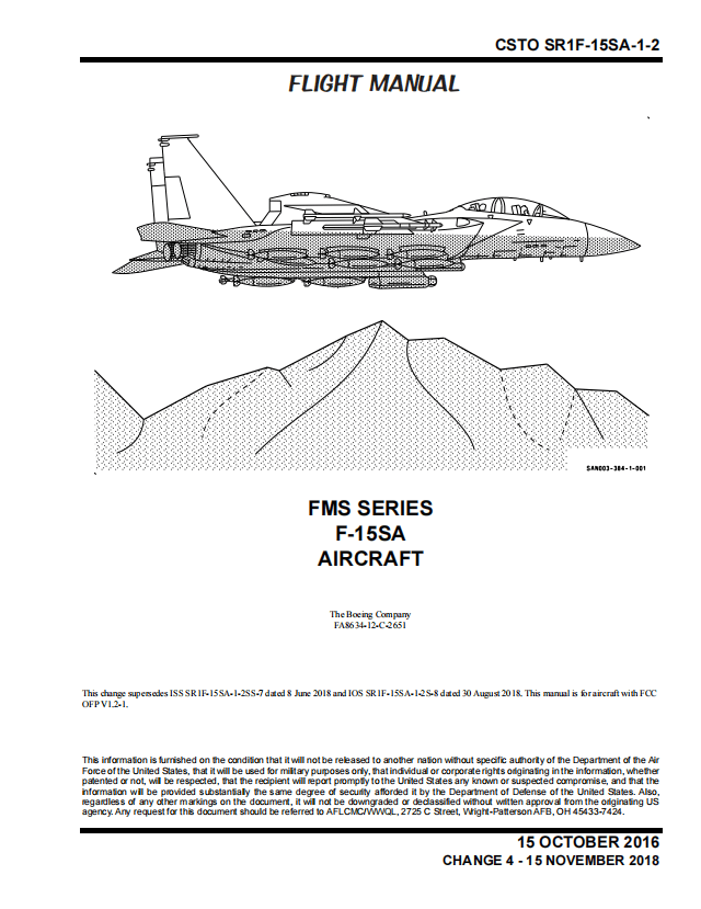 這6份文件裏最醒目的,是一本800多頁的F-15SA戰鬥轟炸機操作手冊。F-15SA並不是美軍裝備的型號,而是沙特從美國訂購的版本。不過眾所周知,沙特可是不差錢的主,所以這批F-15SA的配置也是相當豪華,絕不比美軍自己使用的版本差。