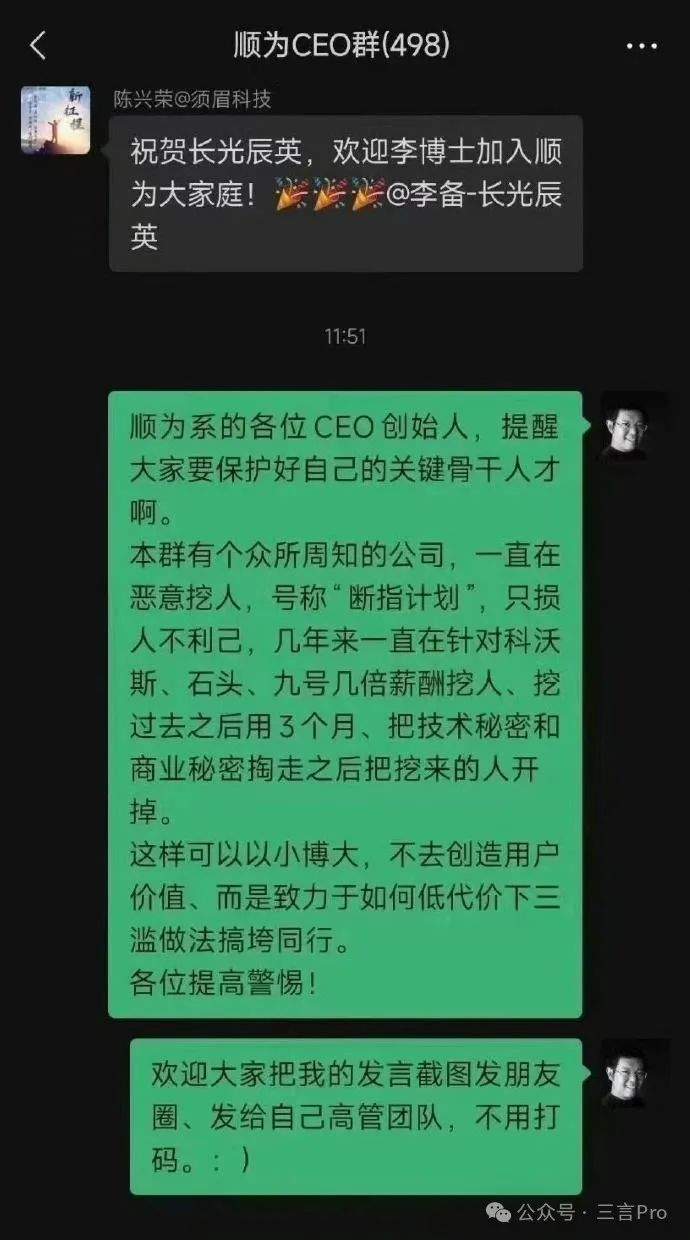 消息人士稱,在三年前,順為CEO羣裏就發生過類似事情,九號CEO怒懟同行挖人。