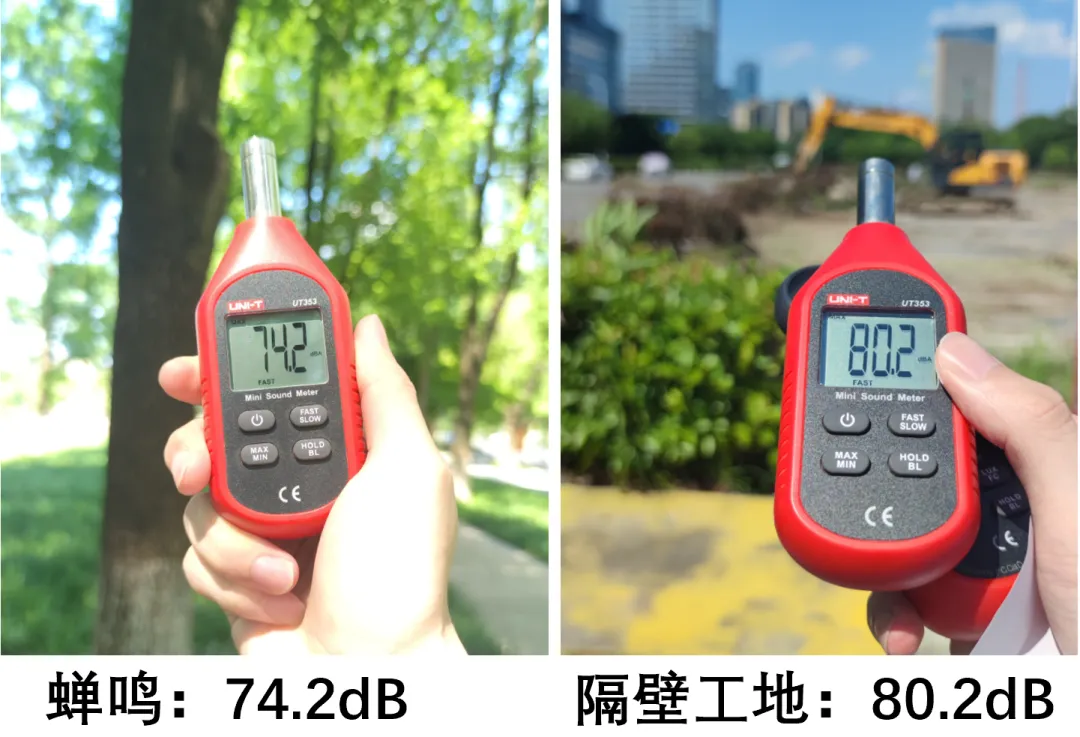 我拿着分貝儀去大樹下面測,蟬鳴聲有74.2分貝,就快趕上隔壁工地了啊!