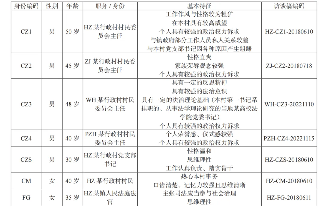 **在方法上,本文主要的技術工具是通過半結構化訪談、座談獲得的實證資料。**我國村治與鄉政關係的同構化程度較高,因此僅圍繞某一地方樣本展開敍事並不會顯著削弱研究的典型性和代表性,但為求嚴謹,筆者在屬於南方地區的華東大區、華南大區、華中大區與西南大區各選取了1個行政村(分別編碼為HZ、ZJ、WH與PZH),分別就村委會主任(編碼為CZ)4人、村支部書記(編碼為CZS)4人、隨機抽樣的村民(編碼為CM)8人與隨機抽樣的基層司法機關一線辦案人員(編碼為FG)4人共計20人進行訪談或座談,並依照本文的論證需求,穿插使用了其中7人的訪談稿片段,他們的基本信息見表1。