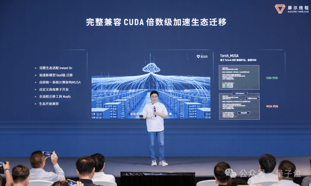 此外,這個集羣還採用了高效且用户友好的MUSA編程語言,並且完全兼容CUDA,配合自動化遷移工具Musify,能夠實現新模型的即時”Day0”級遷移,確保了生態系統的即時適配性,從而幫助客户迅速部署其業務。