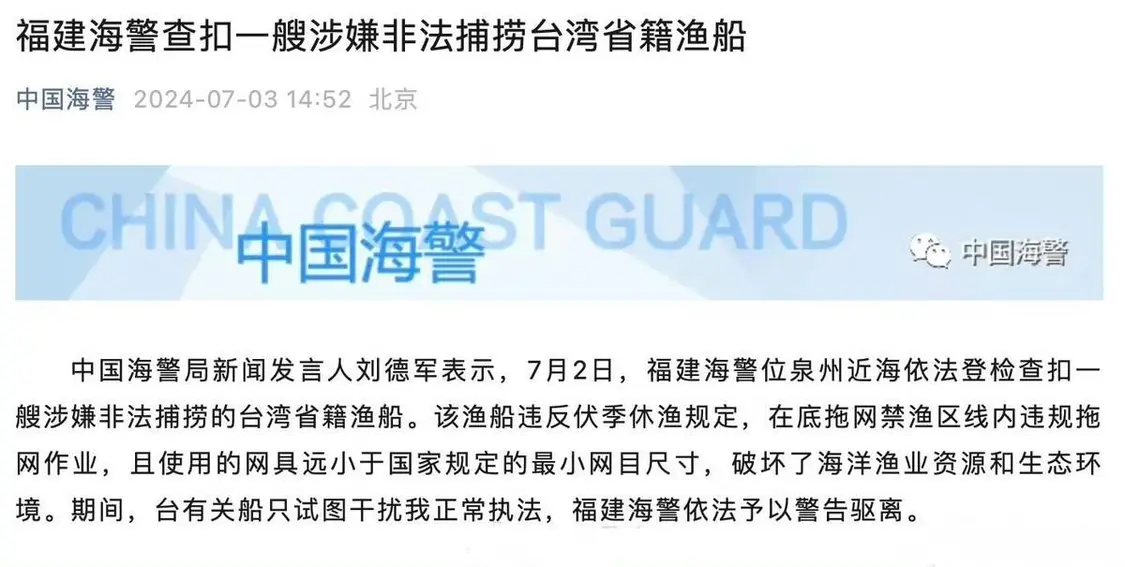 此前,中國海警局和國台辦都回應了大陸查扣台灣省籍漁船一事國台辦回應福建海警查扣台灣漁船,明確指出該船涉嫌非法捕撈,大陸海警是正常執法。從中國海警的通報看,這艘船的違法行為包括違反休漁規定、違規使用底拖網、漁網網目尺寸遠小於國家規定(也就是我們常説的“絕户網”),這都涉嫌觸犯“破壞環境資源保護罪”,違反了刑法第340條規定,最高可處三年以下有期徒刑、拘役、管制或者罰金。