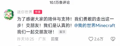 就此,快2年過去,兩邊官方不再有互動或交集,一直到昨天……《迷你世界》官方親自發出想要和《我的世界》和好的信號,並且在評論區裏面圈了《我的世界》官號。