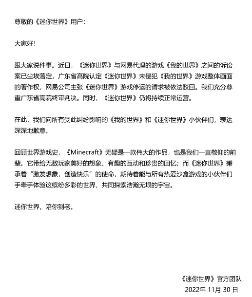 《迷你世界》也針對此事發表了公告,並且表示服從判決。當然,他家的公告有點“春秋筆法”,只寫了法院判其畫面未侵犯著作權,以及駁回停運請求這對他有利的兩方面。