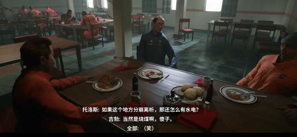 比如“龍套”三人組,製作組在他們身上花了很多筆墨,三人在飯桌上吃飯閒談,託洛斯對於石油鑽井平台的擔憂以及吉勃的嘲笑為後面埋下了伏筆。