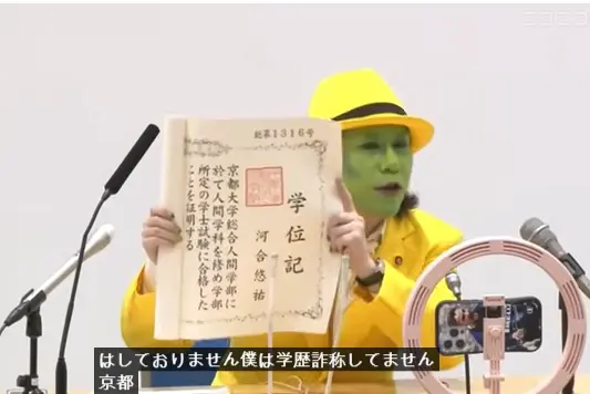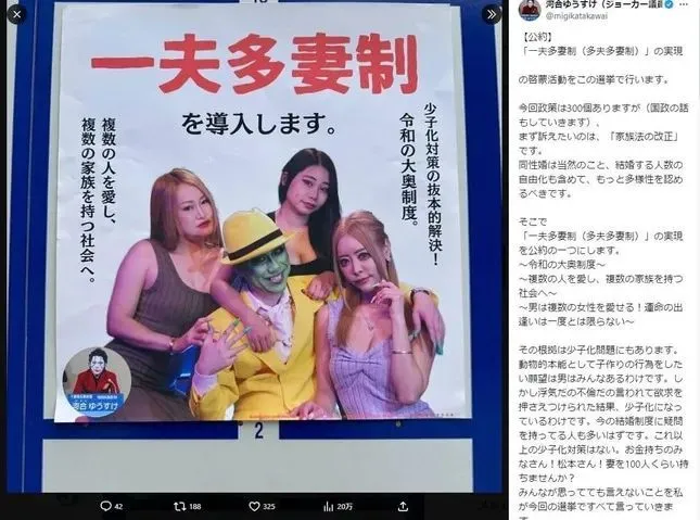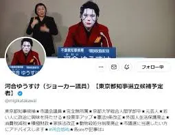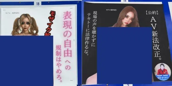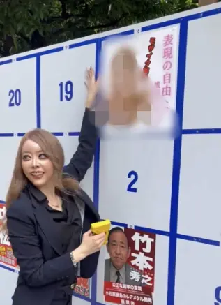自稱“小丑議員”的候選人河合悠祐在東京街頭張貼選舉海報,上面印着幾乎全裸、將雙腿擺出M形姿勢的寫真偶像櫻井MIU,旁邊寫着“停止限制言論自由”的口號。