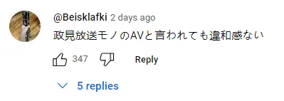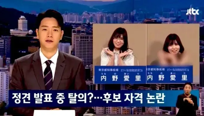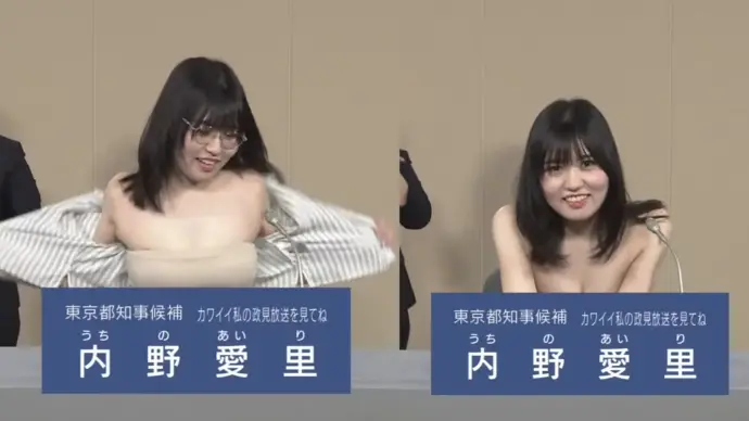 她上半身僅剩一件肉色抹胸,播出時剛好卡在“東京都知事候選人”姓名牌的後面,給人帶來畫面上的衝突感和一絲不掛的聯想。