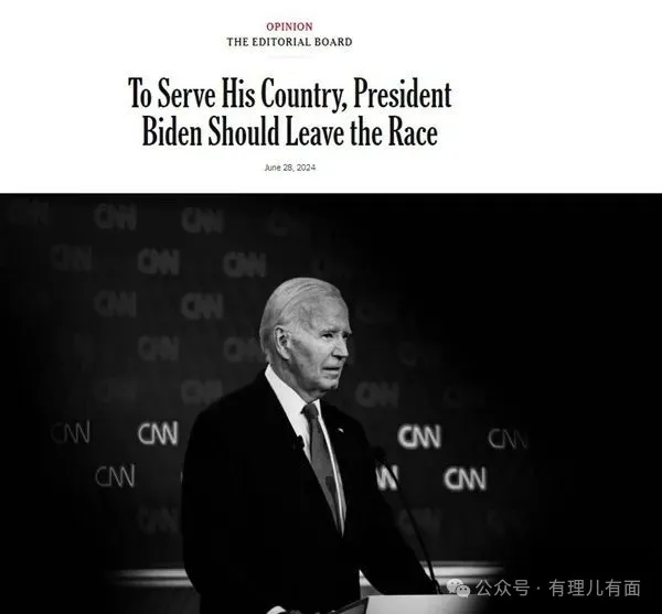 《紐約時報》編輯委員會發表評論文章,標題語重心長地説:《為了服務國家,拜登總統應退出競選》,還配上了拜登的黑白照片,以顯示其過氣之態。
