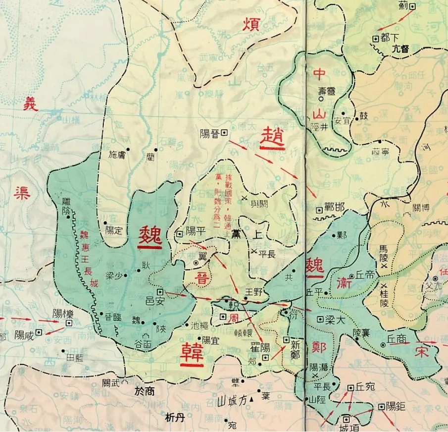 地圖上的分界線有彎有直,形態各異。論複雜程度有3個例子,一個是古代中國的,春秋末期韓、趙、魏“三家分晉”,從母國脱離出來形成的控制範圍示意圖,比犬牙交錯還“老火”。這還是三家換地之後的,已經盡力整合過了,換之前更是亂套。