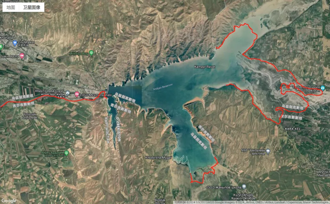 ▲衞星地圖上,烏茲別克一個重要的水庫的界線