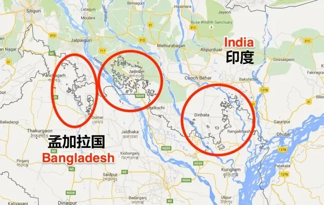 第二個是上世紀印巴分治,現在的孟加拉國是巴基斯坦最大的飛地。東巴和印度交界處又有一百多塊飛地亂飛,飛地裏還有飛地,大腸包小腸,像繩結一樣難分難解……