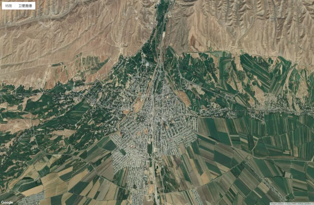 ▲費爾幹納盆地裏,沖積扇這種地形的標本。