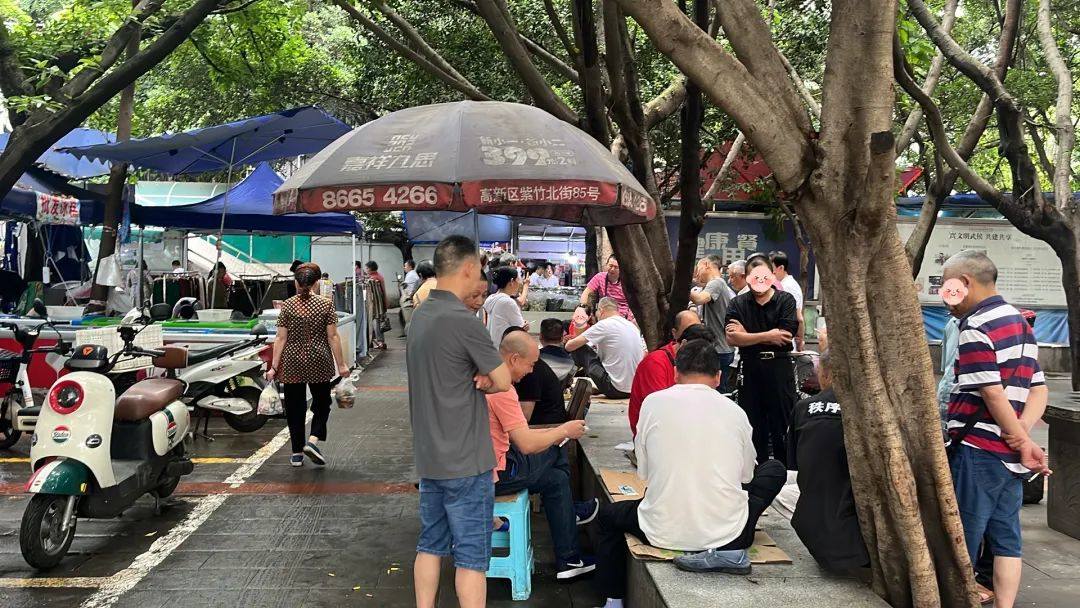 老人家在廣場上喝茶打牌打麻將,年輕人就在對面拍照逛街喝咖啡
