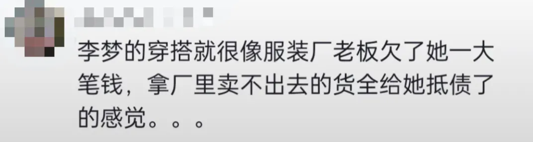 “李夢的穿搭很像服裝廠老闆欠了她一大筆錢,拿廠裏賣不出去的貨給她抵債了的感覺。”