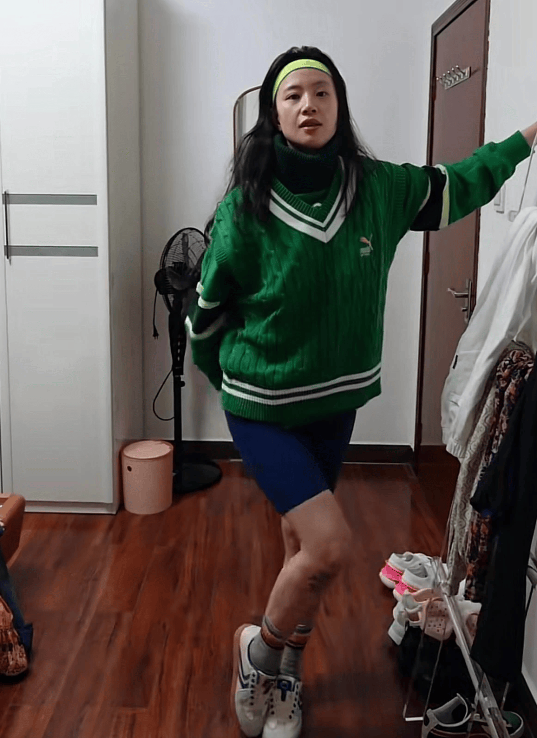熒光綠長袖搭配寬鬆堆堆褲,腳下是一雙紅得發紫的拖鞋;