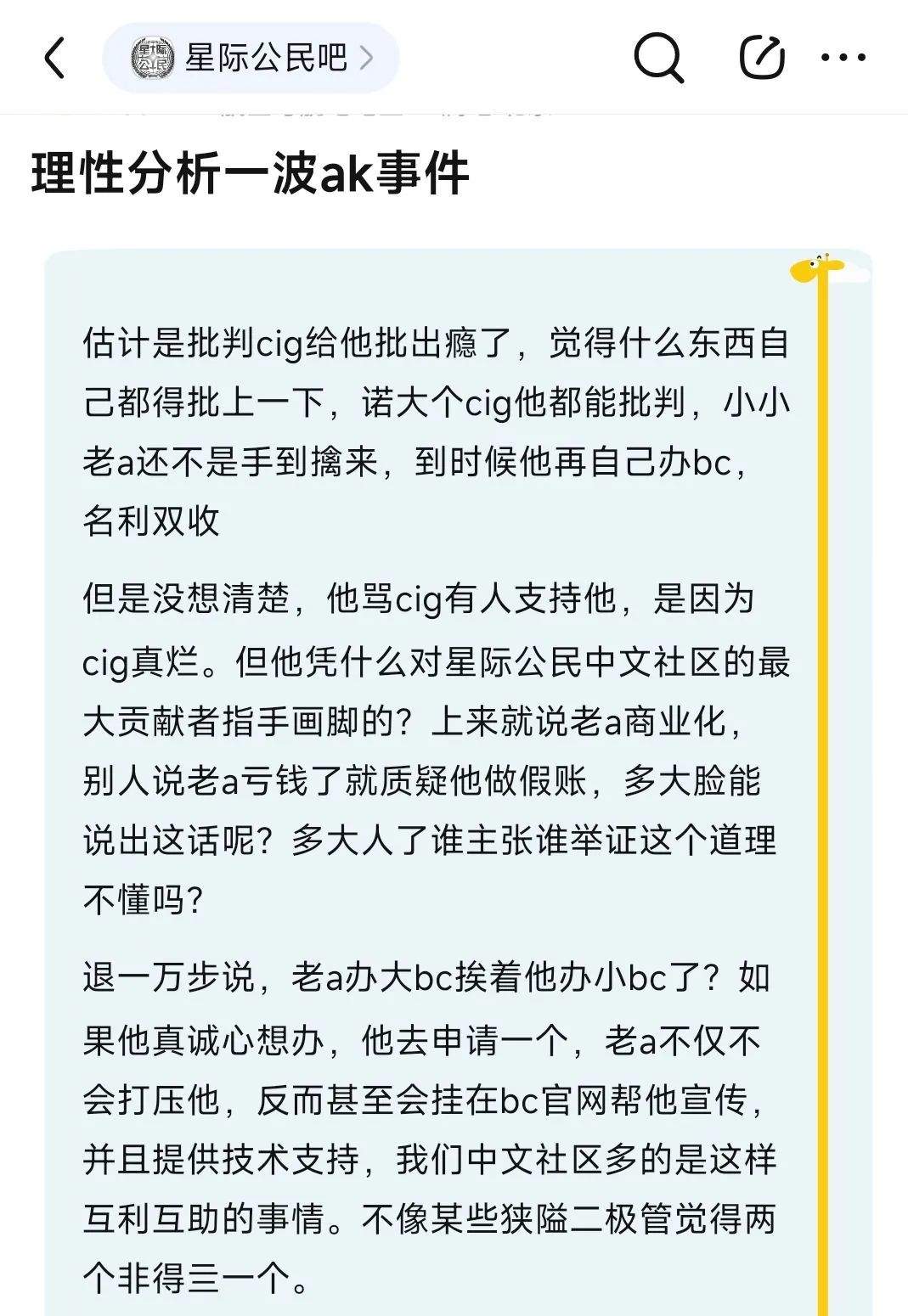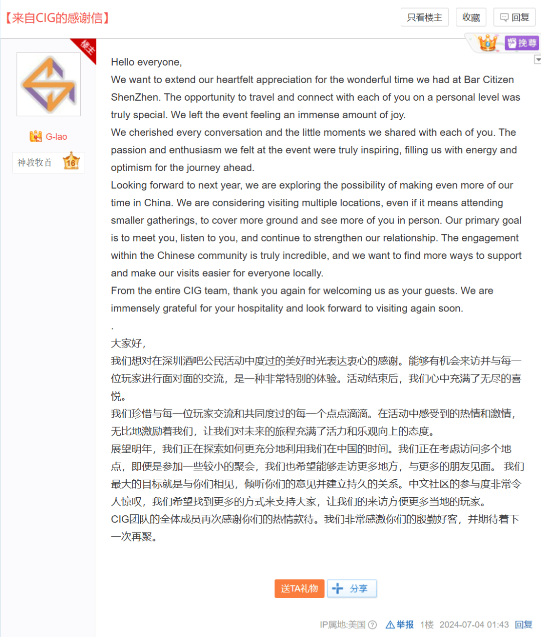 這場風波看起來也驚動了CIG官方,有參與了深圳BC的團隊成員來發帖。分別代表CIG官方和個人來稱讚中國玩家社羣在深圳BC上所表現的熱情,表達希望來年繼續參與此類活動的期許,此外也提到了舉辦更多小型聚會的可能性——這顯然多少也有些來打圓場和安撫人心的意味。