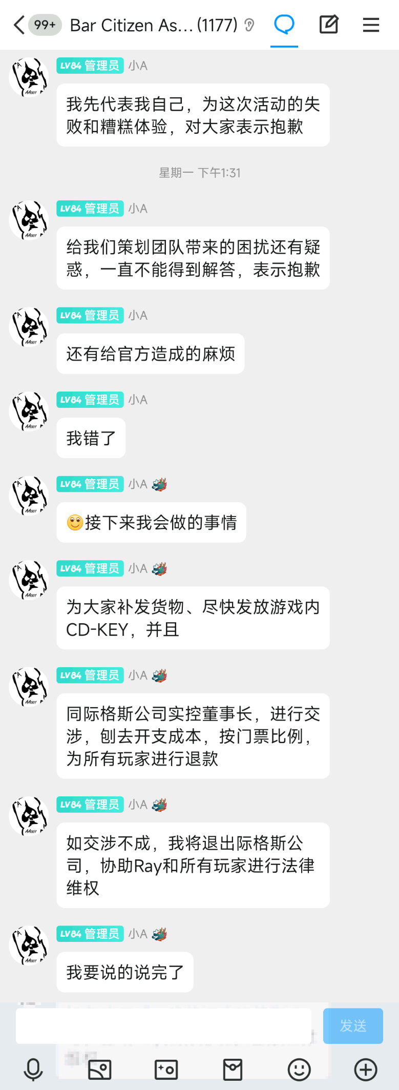 老A表示,他會為這次搞砸了的BC承擔起全部責任,絕對不會玩消失,一定會把缺失的紀念品補足到玩家手中;聚會預算中未使用的資金,他也一定會和公司交涉,按比例退還給玩家——如果不成功,老A將“退出際格斯公司,和玩家進行法律維權”。