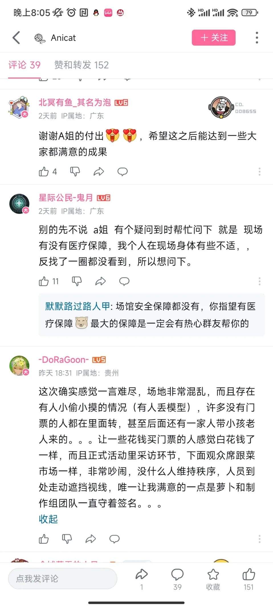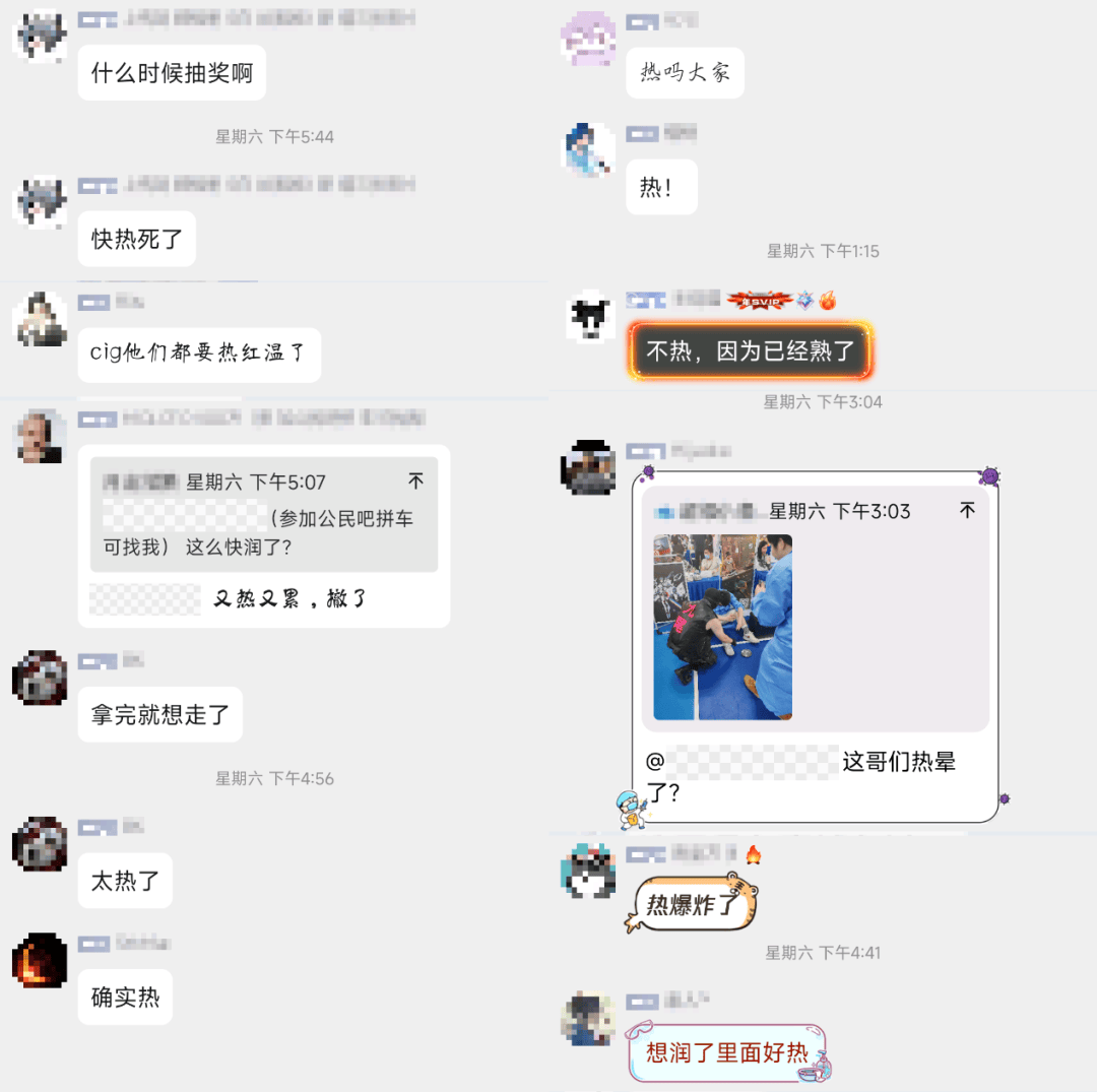 從下午1點一直持續到晚11點的活動中,不少愛好者實在是扛不住濕熱,選擇了半道離場,而當活動最後一次現場抽獎環節結束後,更多人也離開了現場。在愛好者們互相溝通的大小羣裏,對於温度的抱怨也比比皆是,不少人甚至認為,如果沒有下午的一場大雨降温,那可能會有很多參與者最後因中暑倒下。
