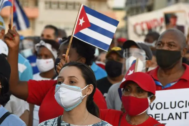 ▲民眾在古巴首都哈瓦那參加愛國集會,抗議美國對古巴長期封鎖、反對美國政府資助反古勢力煽動騷亂。新華社發(華金·埃爾南德斯攝)