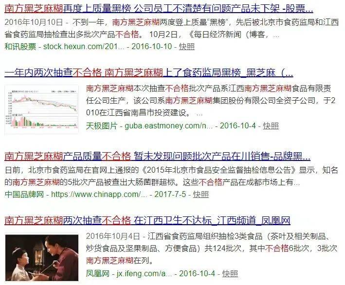 **禍不單行,眼看新品未能打開市場,經典款黑芝麻糊又“城門失火”。**2016年1月,北京市食藥監局抽檢中,南方黑芝麻糊有5批次產品被查出大腸菌羣超標;2016年9月,3批次南方黑芝麻糊因大腸菌羣、菌落總數超標不合格,多次出現食品安全問題,南方黑芝麻的口碑遭到重挫。