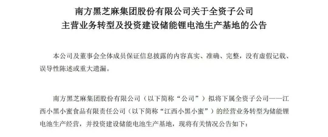 彷彿進入了一種“走火入魔”的狀態,眼看窟窿越來越大,南方黑芝麻集團卻沒有停手的打算。2023年4月,南方黑芝麻將全資子公司江西小黑小蜜食品有限責任公司的經營業務轉型為儲能鋰電池生產經營,並投資35億元建設儲能電池生產基地,從而跨界儲能鋰電項目。