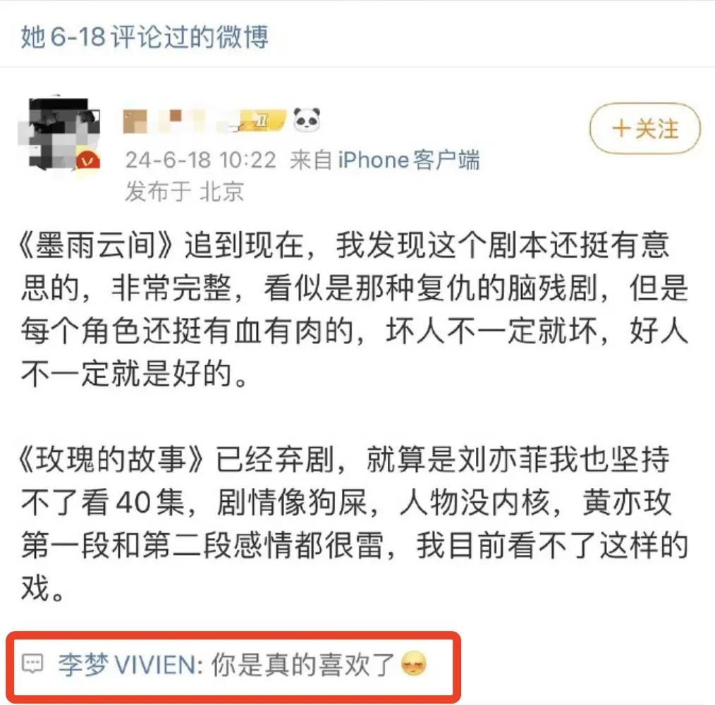 是她在一條誇讚《墨雨雲間》的微博底下留言,“你是真的喜歡了”。