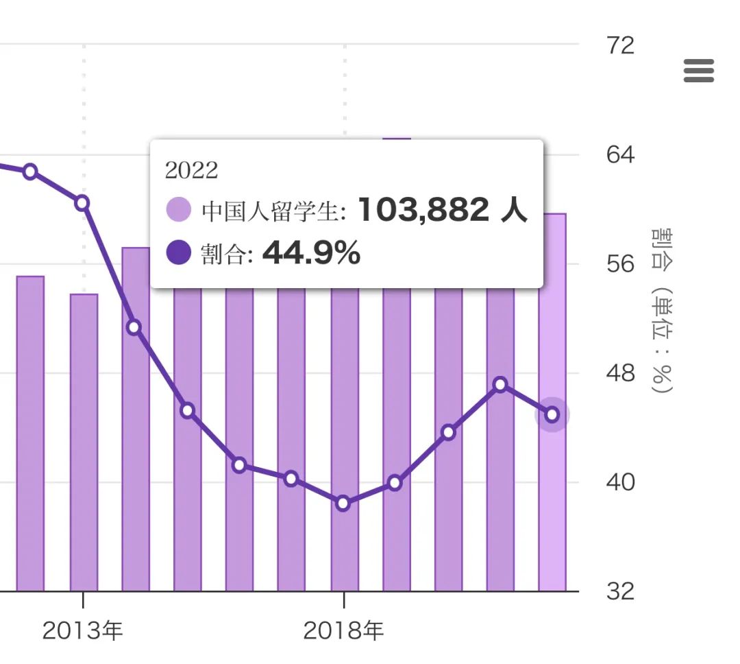 2022年,在日的留學生約為23萬人,中國留學生為10萬3882人,佔比44.9%左右。