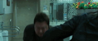 先是一拳打到對方肚子上,然後橫空甩出撞碎玻璃。