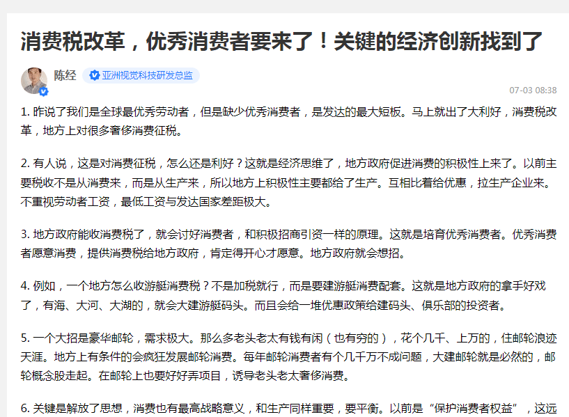 這篇文章,單看標題就覺得有點聳人聽聞。這位老兄在文章中以他固有的一種頗為誇張的方式宣稱,消費税改革將引領“優秀消費者”時代的到來,並斷言這是經濟創新發展的關鍵所在。他認為,這一改革將激發地方積極發展高端消費產業的動力,特別是郵輪經濟等高端領域,展現出了他對消費税改革促進未來經濟的樂觀預期。