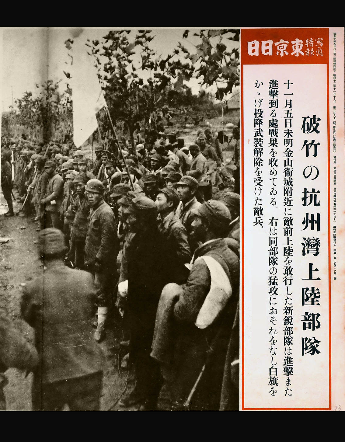 【日文】破竹の杭州灣上陸部隊:十一月五日未明金山衞附近に敵前上陸を敢行した新鋭部隊は進擊また進擊到る處戰果を收めてるる。同部隊の猛攻におそれをなし白旗をかげ投降武裝解除を受けた敵兵。