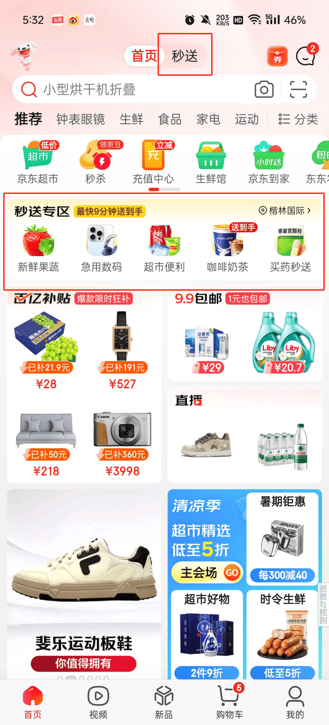 520前夕,京東整合原即時零售品牌京東小時達、京東到家,統一升級為 “京東秒送”,提供最快9分鐘送達的購物體驗。在京東APP裏,“秒送”與“首頁”並列入口,同時又新增首頁關鍵位置“秒送專區”,處於APP一級入口。