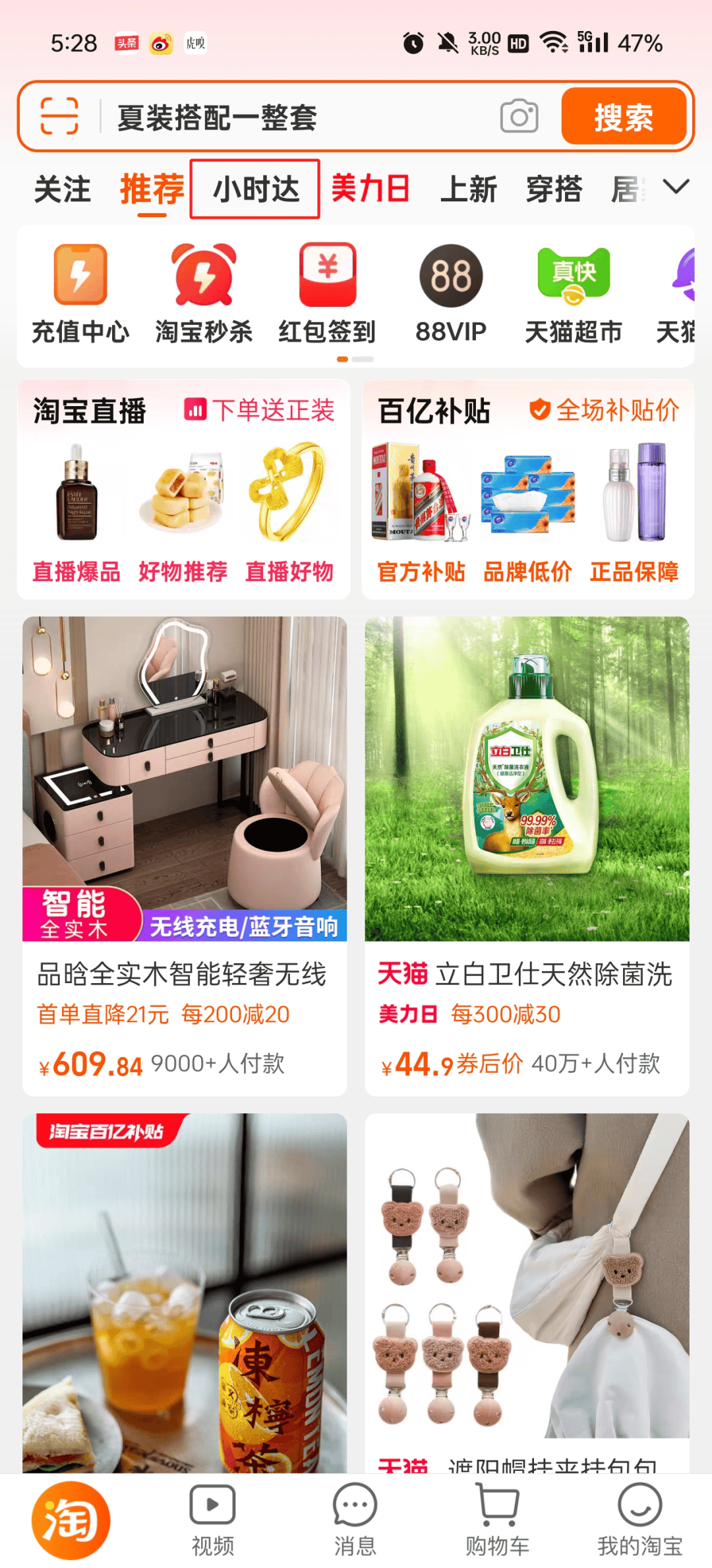 7月3日,淘寶小時達業務升級,在最新版的淘寶App首頁,頂部Tab為“小時達”新增了一級流量入口。把即時零售業務送上首頁的不僅只有淘寶,更早一些時候,京東同樣將代表即時零售業務的“京東秒送”送上首頁。