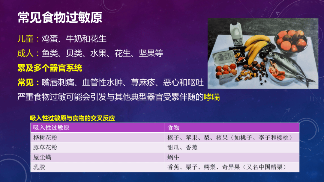 我們兒童一般主要吃雞蛋、牛奶,這些食物最常見,從小就吃,所以一部分小孩會出現對雞蛋或者牛奶裏面蛋白成分的過敏,而我們成人,多數會吃到肉類、魚類、貝類、水果、花生等堅果,這些也會產生一些過敏的反應。