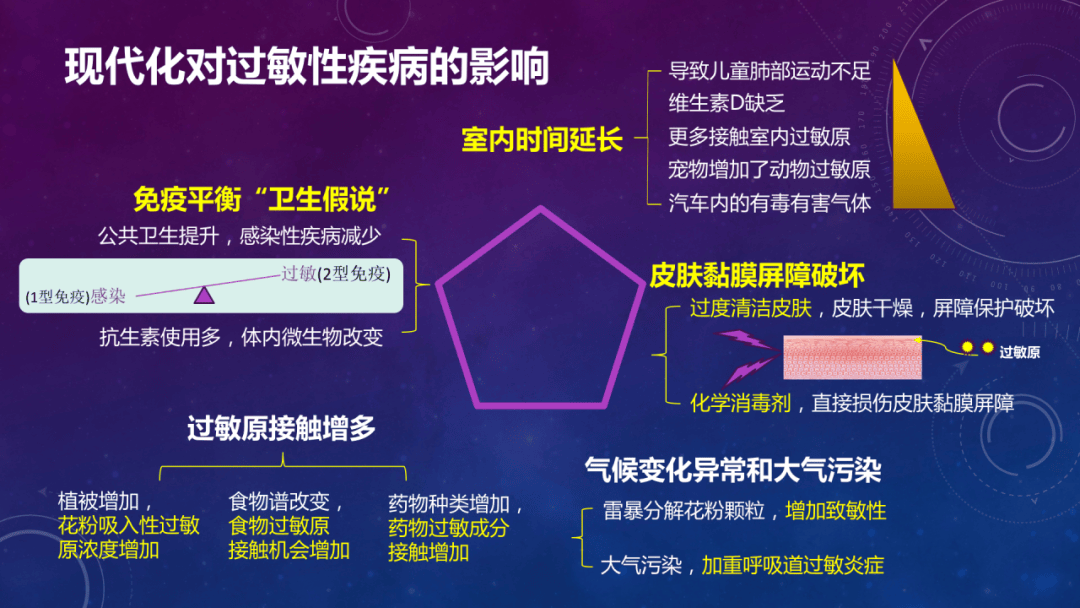 當然還有很多方面,我們都會碰到過敏原接觸的增加,植物的增加、食物的增加,都有可能使我們接觸過敏原增加,這些都是我們現代化帶來的一些不太好的影響。