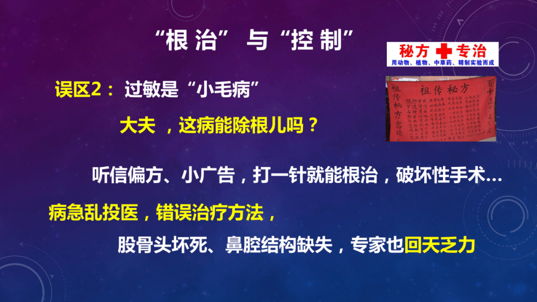 上網檢索一下,或者聽人介紹,有人説能夠根治過敏性疾病,所以就去採用這種方法。這些方法恰恰不是很規範的方法,就會使患者長期反覆被注射一些激素類的藥物,或者是藉助一些破壞性的手術,這些治療方式可能會導致的後果就是,像股骨頭壞死,或者是結構永久的喪失。