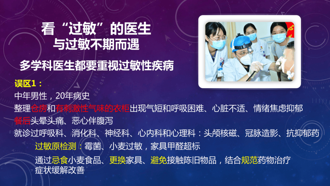 我們有一些患者,就是因為對過敏性疾病不太瞭解,因為吸入了這些有毒有害的刺激性的氣味,或者是接觸灰塵多了以後,會出現這些症狀,甚至是可能吃了一些食物,會出現消化道過敏的症狀,但是他可能認識不清,就去看呼吸科、消化科,一般會給他按照這種炎症去診斷和治療,沒有想到他可能是過敏引起的,這樣他的症狀就得不到明顯的控制,後來可能提示你是不是有過敏?來看一下過敏的醫生吧……