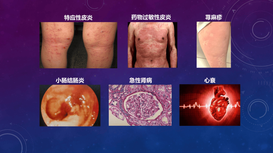 這些情況也是我們平時經常會遇到的一些過敏性疾病的表現,像皮膚過敏、像這些特應性皮炎,或者藥物過敏的皮炎,可能不是特別常見,但是我們有的人也有這種表現。