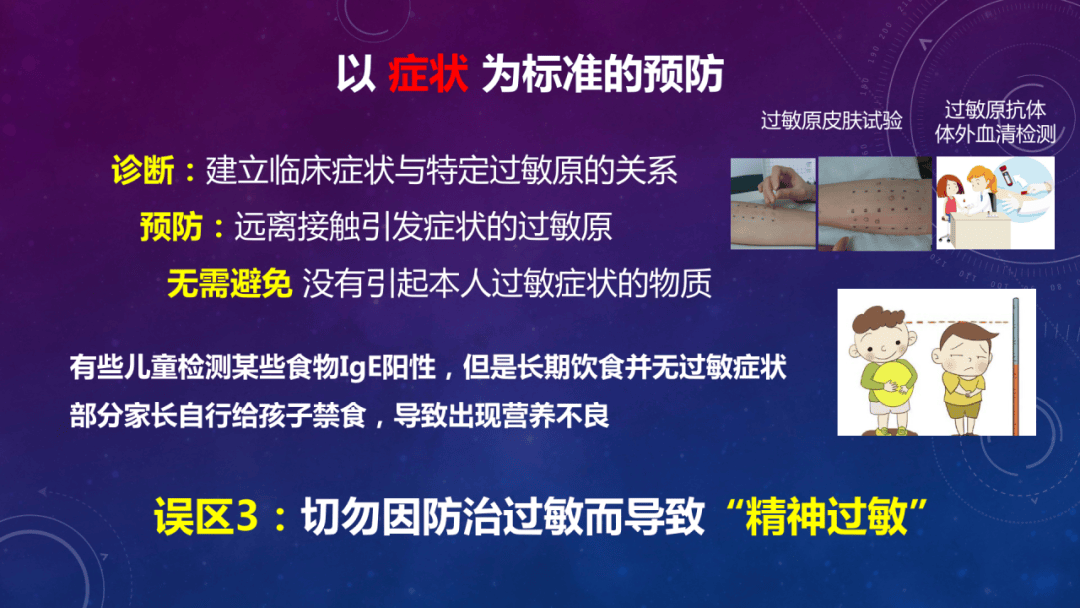 我們有一些家長給孩子查完過敏原以後,發現孩子有一些食物的過敏原陽性,其實孩子長期吃這些食物,並沒有任何的症狀,但是家長可能擔心以後孩子會不會出現過敏,那麼就自動給孩子禁食這些食物。這些營養成分缺失了以後,看到孩子就面黃肌瘦,再一問,就發現是因為自己把這些食物都給忌了,禁食,這些都是一些錯誤的做法,因此切勿因為防治過敏而導致精神過敏,這個是我們不提倡的;