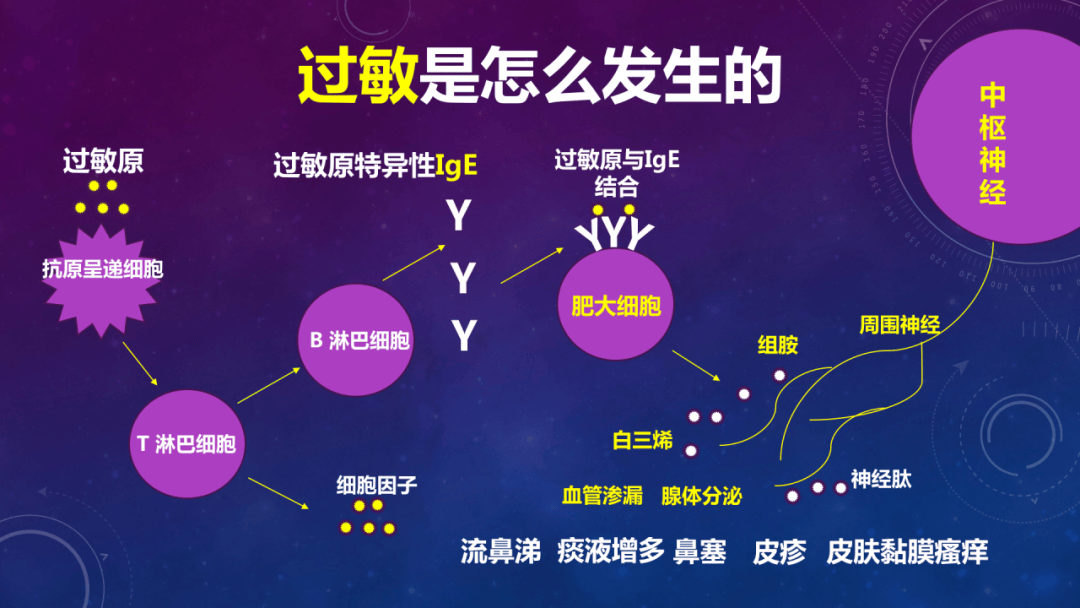 我們接觸了過敏原以後,各種過敏原進入我們體內,會被我們人體的一些抗原提呈細胞先接觸,處理其中的一些過敏的成分,然後通過我們大家比較瞭解的T淋巴細胞和B淋巴細胞,產生一些過敏原特異性的抗體,這個過程叫做“致敏”的過程。