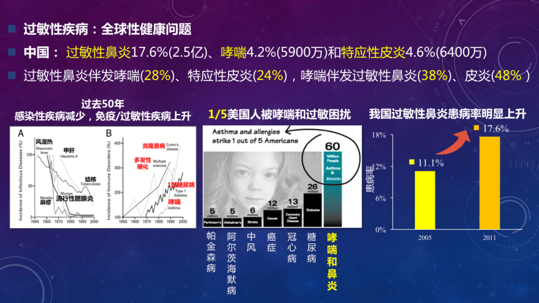 確實大家有這種感受,可能三十、四十年前,我們的父輩、祖輩很少聽説過敏性疾病,而現在我們身邊在座各位,可能就有百分之二、三十的人,有過敏性疾病的一個經歷。