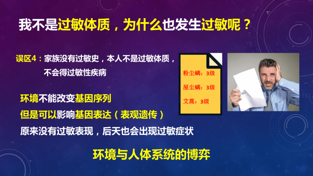 他可能會以各種表現來去求治,因此如果我們不是搞過敏的醫生,就很容易忽視過敏性疾病,包括我自己。其實我自己也有過敏,而我的孩子也有過敏,但是這些過敏性疾病的發生很突然,你可能覺得,我過去沒有這個情況,孩子以前也沒有這個情況,為什麼突然就發生了?這時候你就容易忽視它,這説明過敏性疾病還是要引起我們的一些重視,包括專科的醫生;
