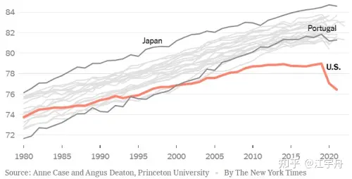 美國人出生時的預期壽命落後於其他富裕國家。橙色線條代表美國人,上方和下方深灰色線條分別代表日本人和葡萄牙人。