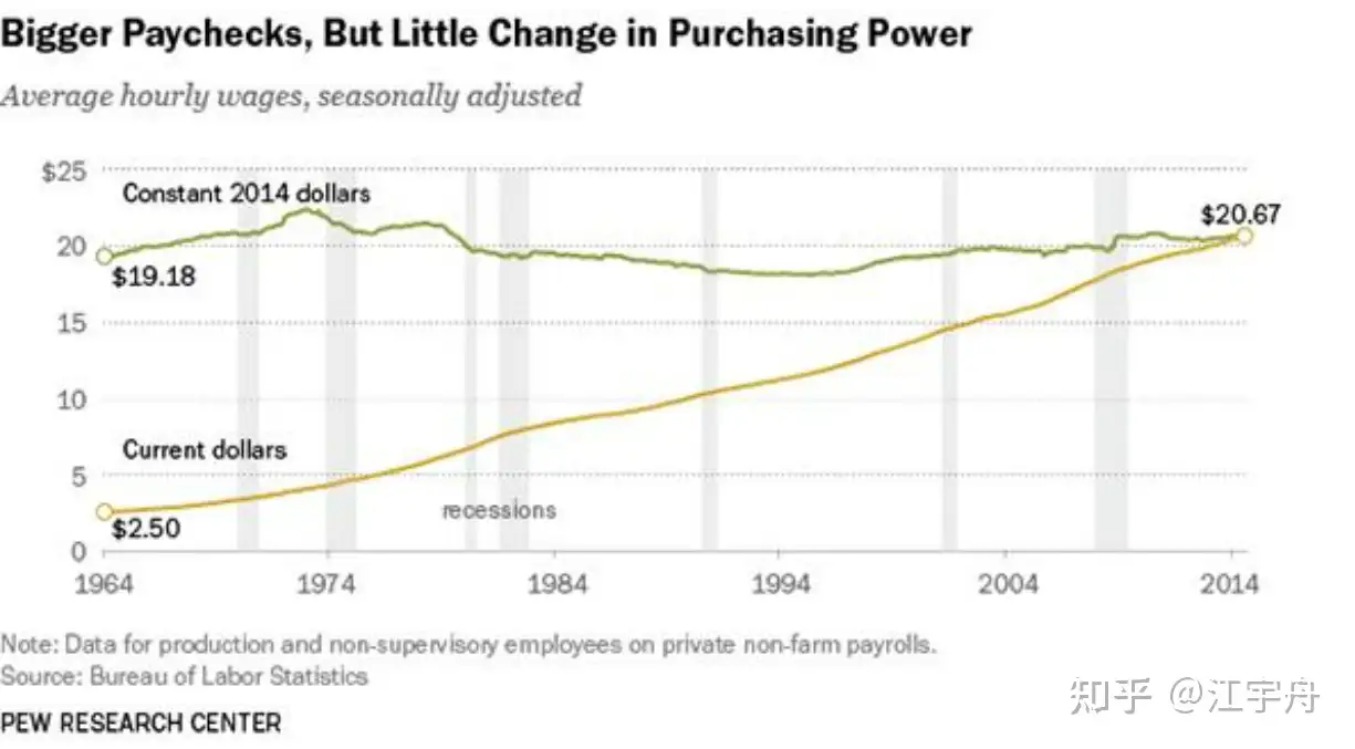 皮尤中心統計的半世紀美國工人階級收入變化,綠線為工資按實際購買力變化曲線,黃線為名義工資變化曲線。