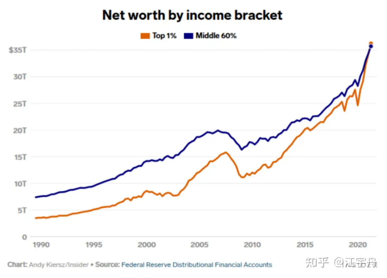 根據美聯儲最新發布的美國財富分佈情況,截至2021年第二季度,美國收入最高的1%的家庭總淨資產為36.2萬億美元,超過了中產家庭持有的35.7萬億美元。這是自1989年美聯儲開始追蹤該數據以來,1%富人擁有的財富首次超越60%的中產。