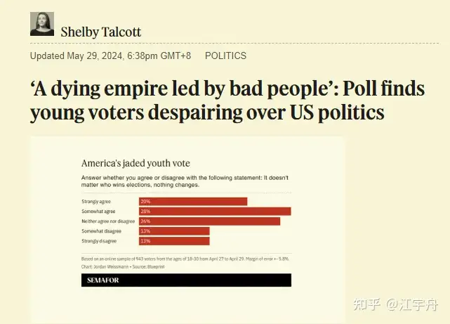 美國媒體Semafor網站報道,民主黨戰略組織“Blueprint”公佈的一項最新民意調查顯示,美國18歲至30歲的選民中至少有一半人對美國的政治制度持負面看法,其中超過60%的人認為美國正在衰落,65%的人強烈或有點同意“幾乎所有政客都是腐敗的,並從他們的政治權力中賺錢”[[12]](https://www.zhihu.com/question/646387458/answer/3551673298)。