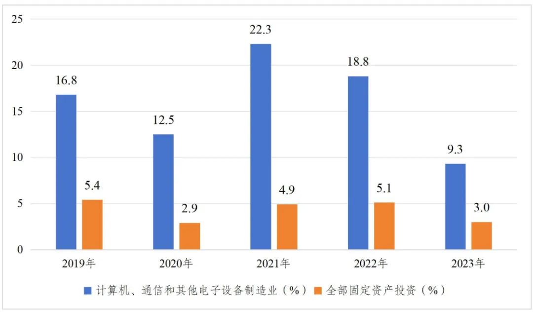 圖6 2019年—2023年計算機、通信和其他電子設備製造業與固定資產投資同比增速