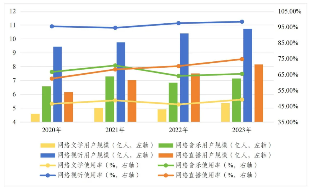 圖10 2020 年—2023 年網絡文學、網絡音樂、網絡視聽、網絡直播用户規模和網民使用率
