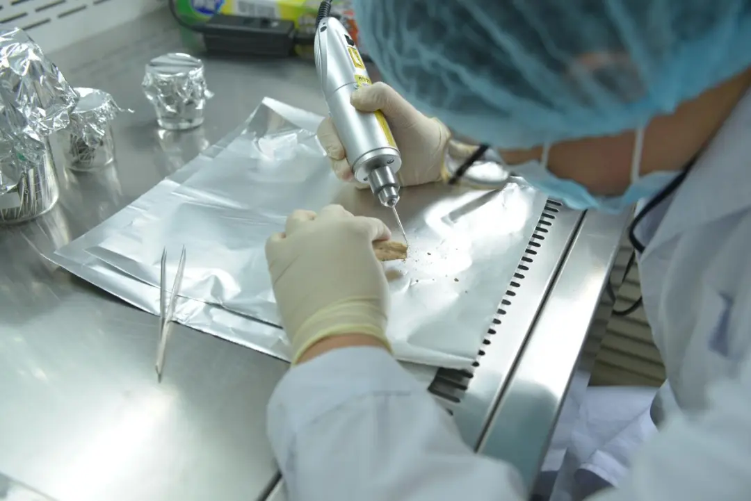 研究人員對動物骨骼化石進行古蛋白採樣。蘭州大學資源環境學院張東菊教授團隊供圖