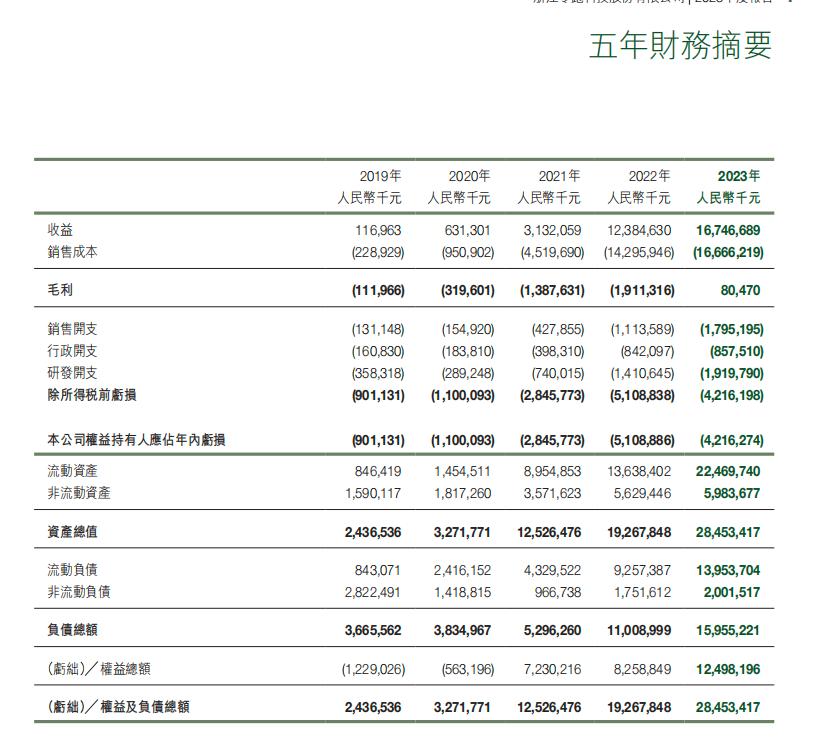 零跑汽車近五年財務概要,圖源零跑汽車2023年財報