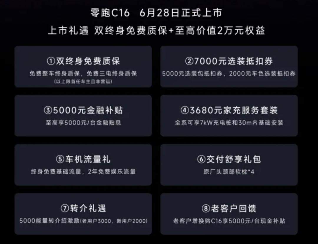 此外,在購車權益上,零跑還給出整車終身質保、三電終身質保、5000元選裝包抵扣券、換購5000元補貼、5000元貼息、價值3680元充電樁安裝等優惠。